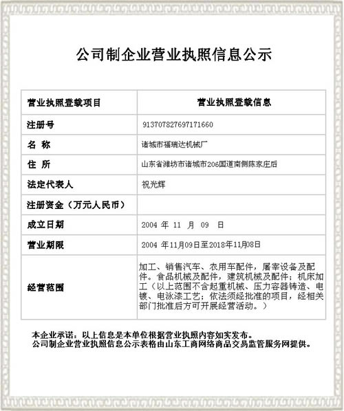 • 公司簡介      諸城市福瑞達機械有限公司 是一家專業開發(fā)設計,生產制造畜禽屠宰設備的私營企業.位于山東省諸城市龍都工業園,緊靠206國道,膠新鐵路,交通十分便利.       我廠現有中,高級技術人員數名,有多年的設計與制造畜禽宰殺機械的理論和經驗.可根據客戶的要求進行前期的工藝設計及流程布局,中期的設備安裝與調試,以及后期的售... [詳細內容]